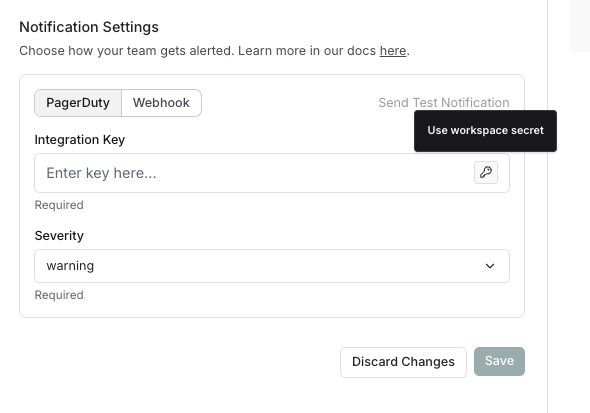 - 单击密钥图标以将集成密钥保存为工作区密钥或选择现有的工作区密钥。作为最佳实践,我们建议将集成密钥保存为工作区密钥,而不是直接添加它。这将允许您在工作区的警报中重复使用相同的密钥。
