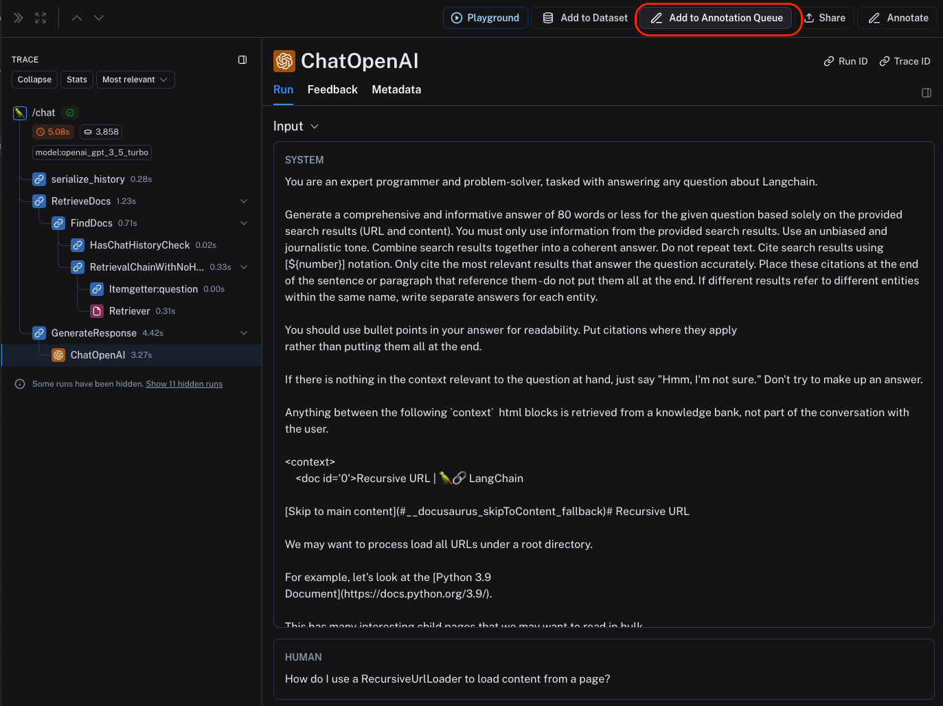 - Set up an automation rule that automatically assigns runs which pass a certain filter and sampling condition to an annotation queue.