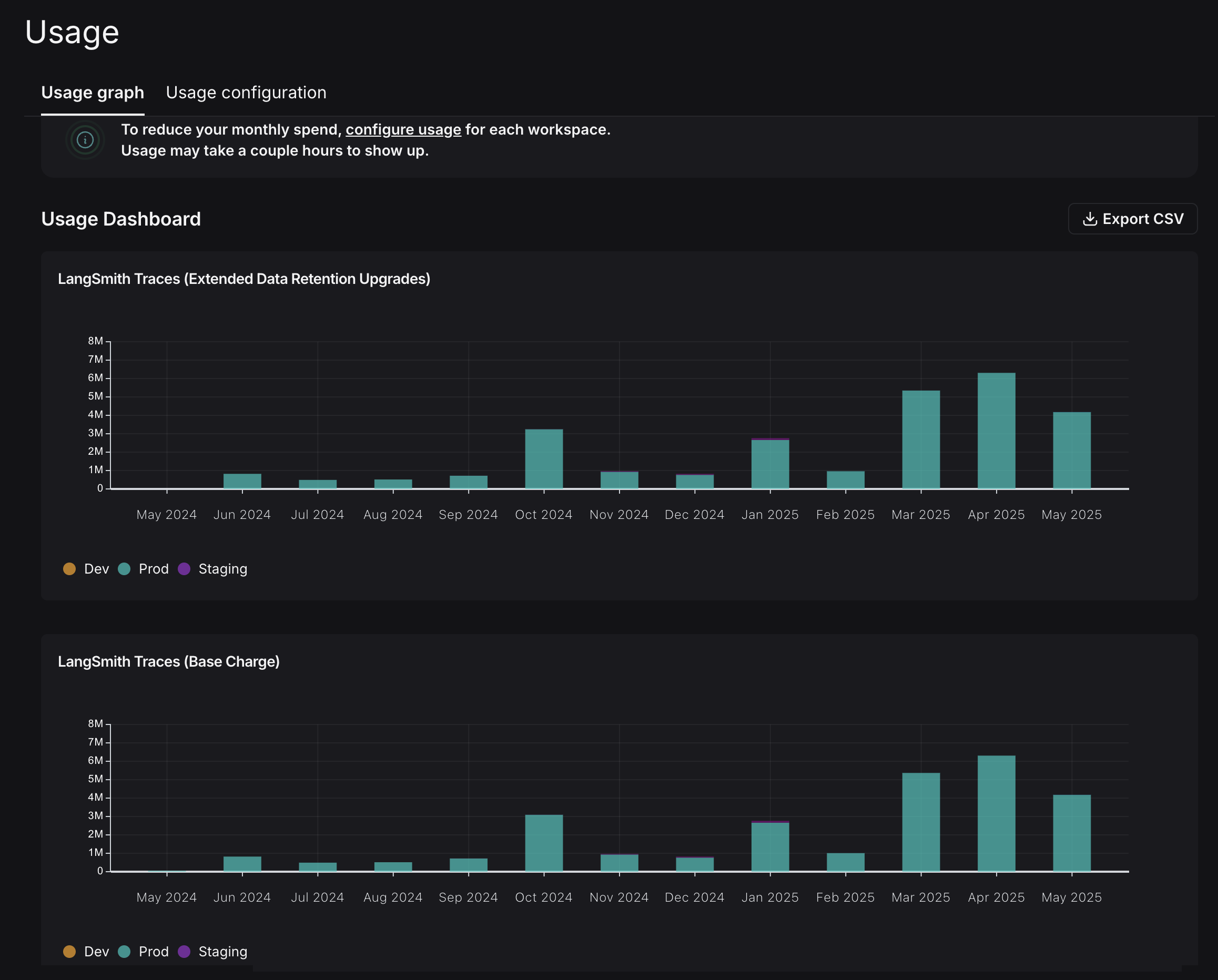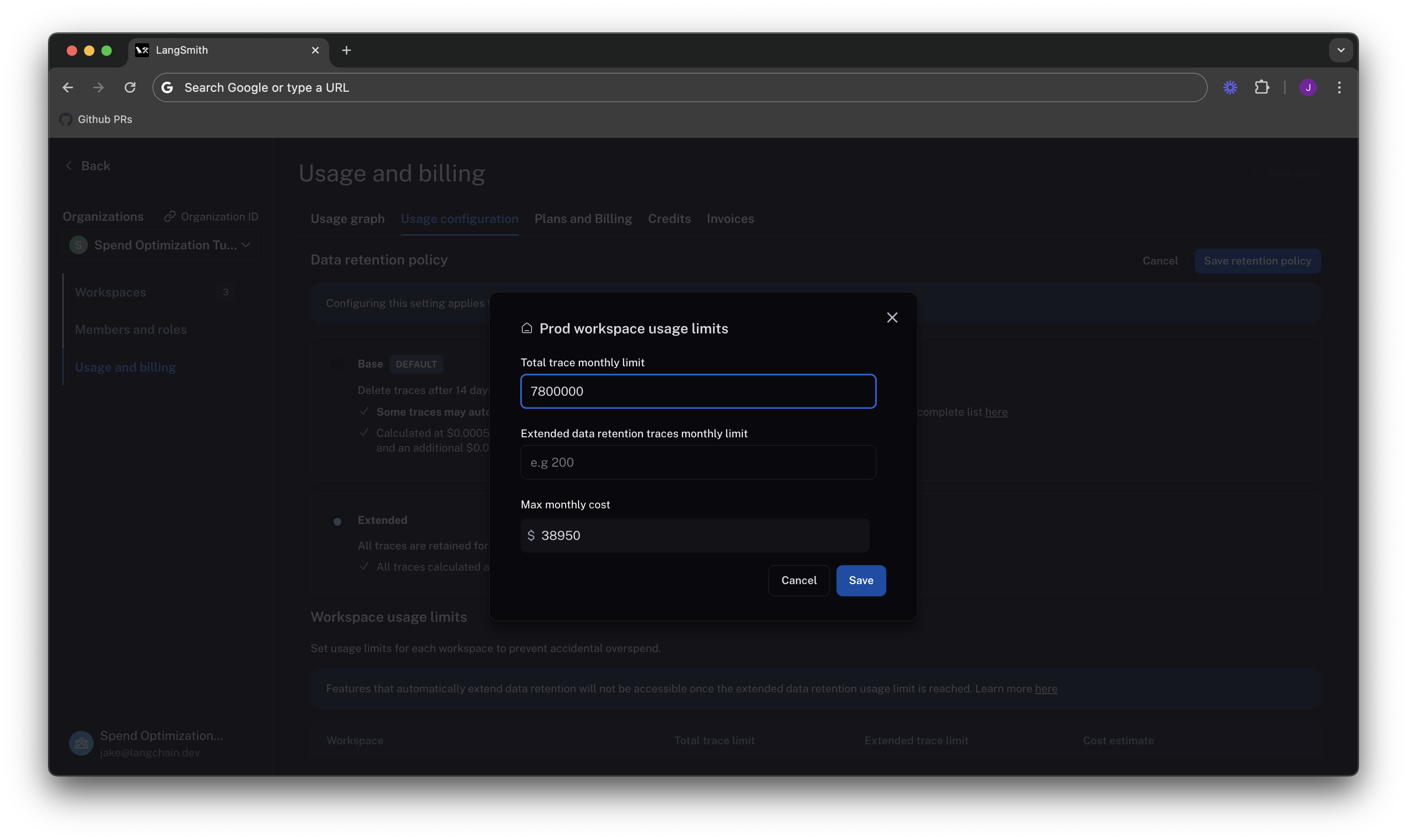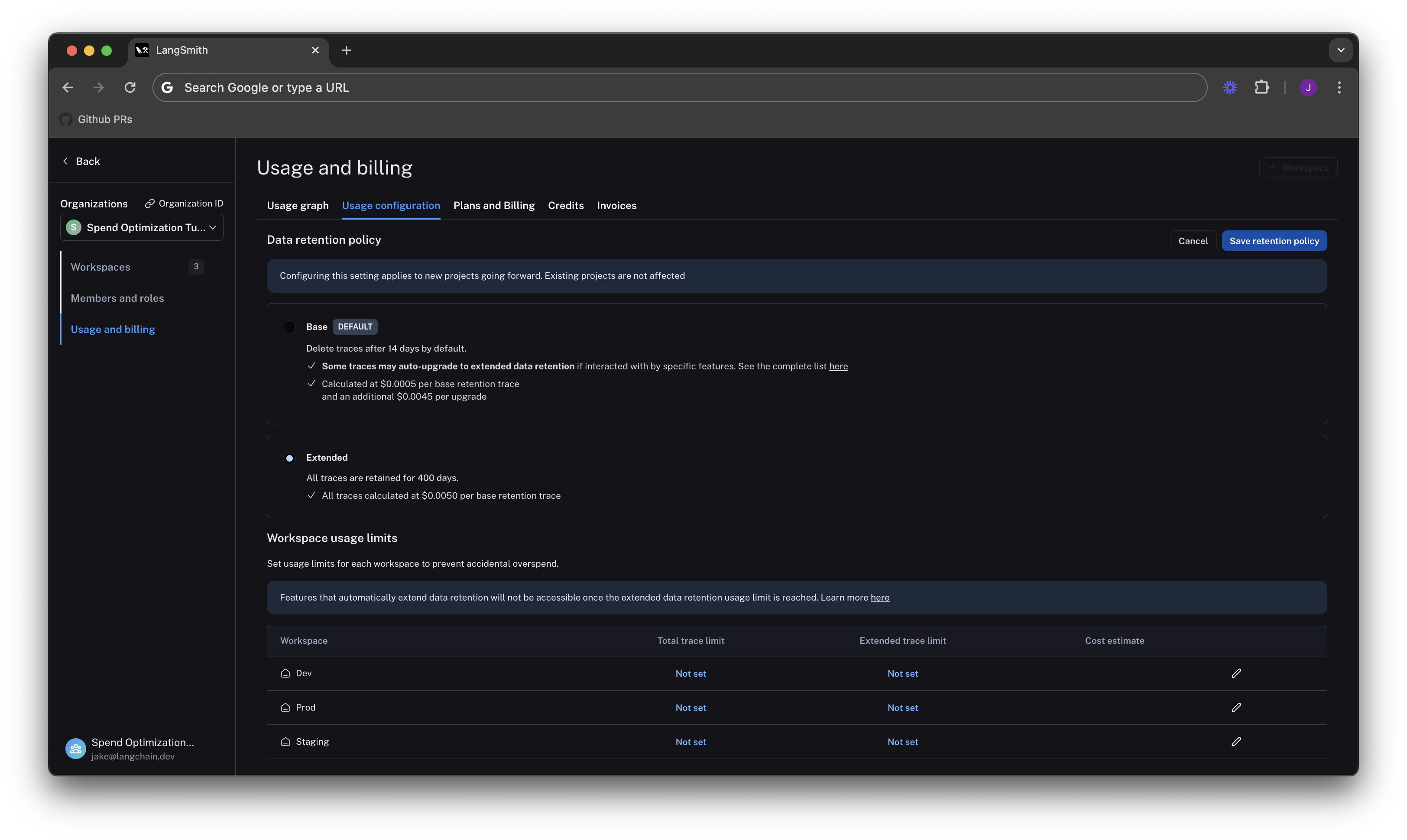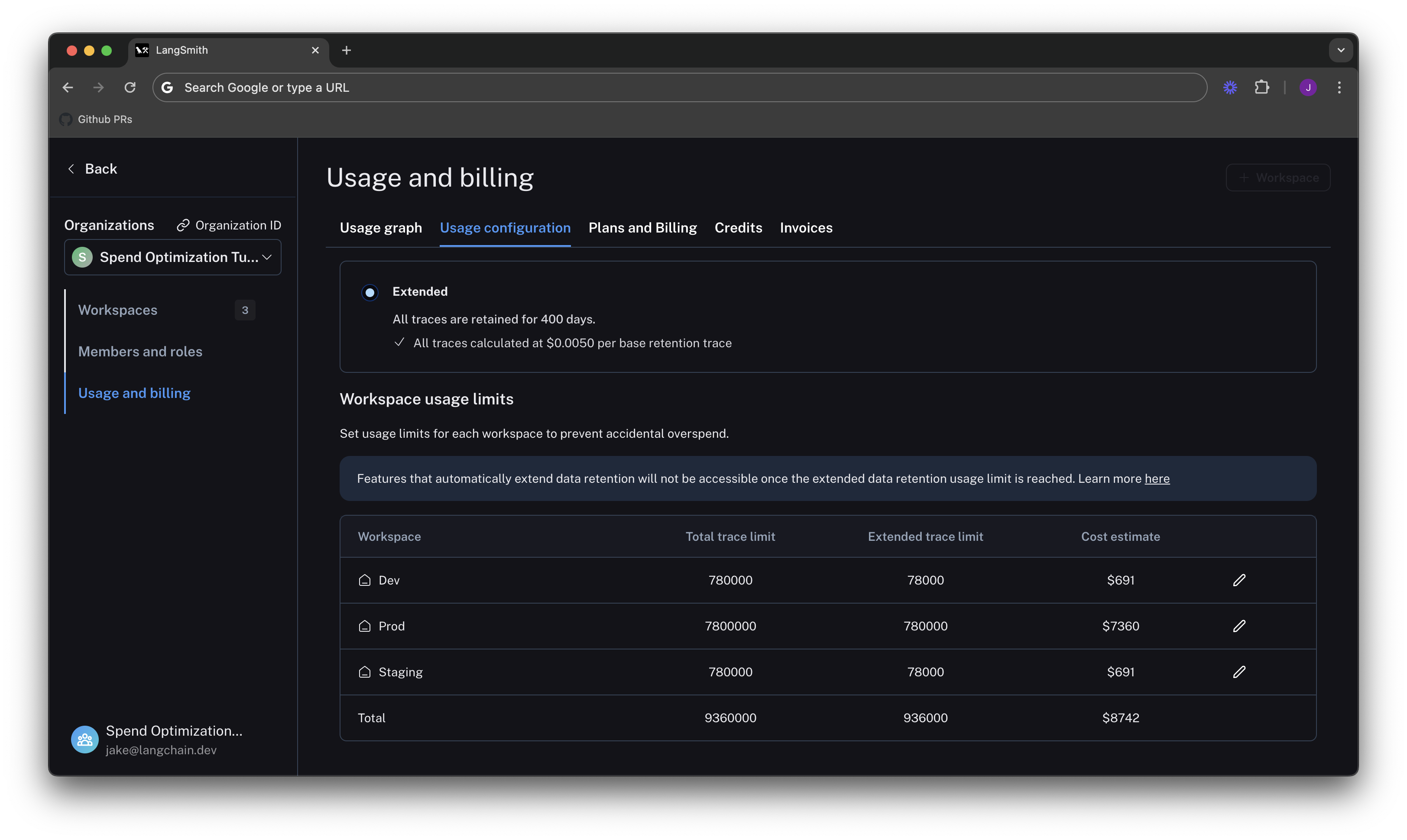 In the previous section, you managed data retention settings to optimize existing spend. In this section, you will use usage limits to prevent future overspend. LangSmith has two usage limits: total traces and extended retention traces. These correspond to the two metrics tracked on the usage graph. You can use these in tandem to have granular control over spend. To set limits, navigate back to Settings -> Usage and Billing -> Usage configuration. There is a table at the bottom of the page that lets you set usage limits per workspace. For each workspace, the two limits appear, along with a cost estimate: