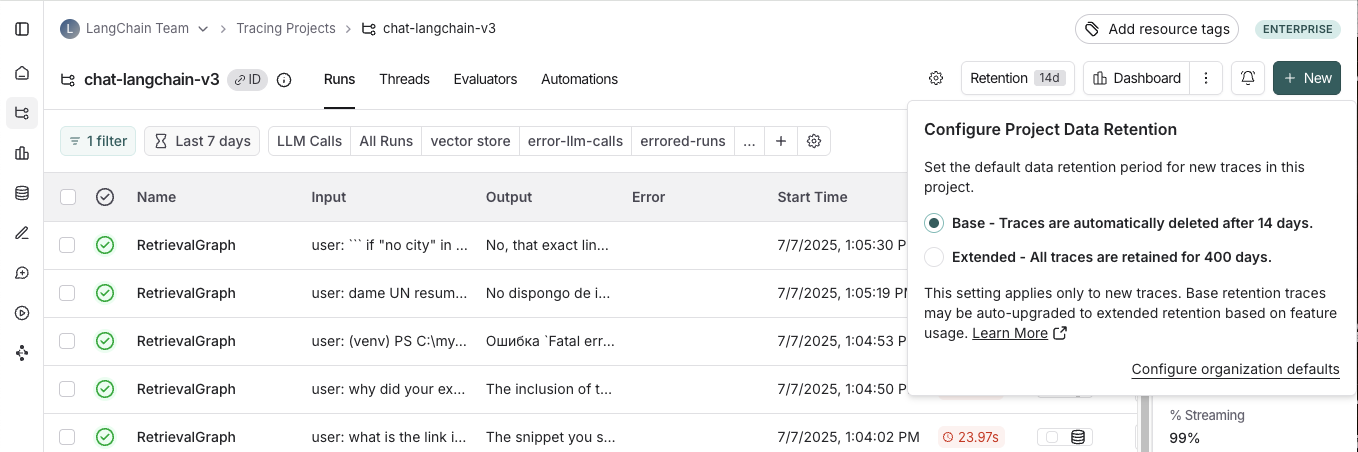 LangSmith charges differently based on a trace’s data retention, where short-lived traces are an order of magnitude less expensive than ones that last for a long time. In this optimization, you’ll learn how to get optimal settings for data retention without sacrificing historical observability, and see the effect it has on the bill.Change org level retention defaults for new projects