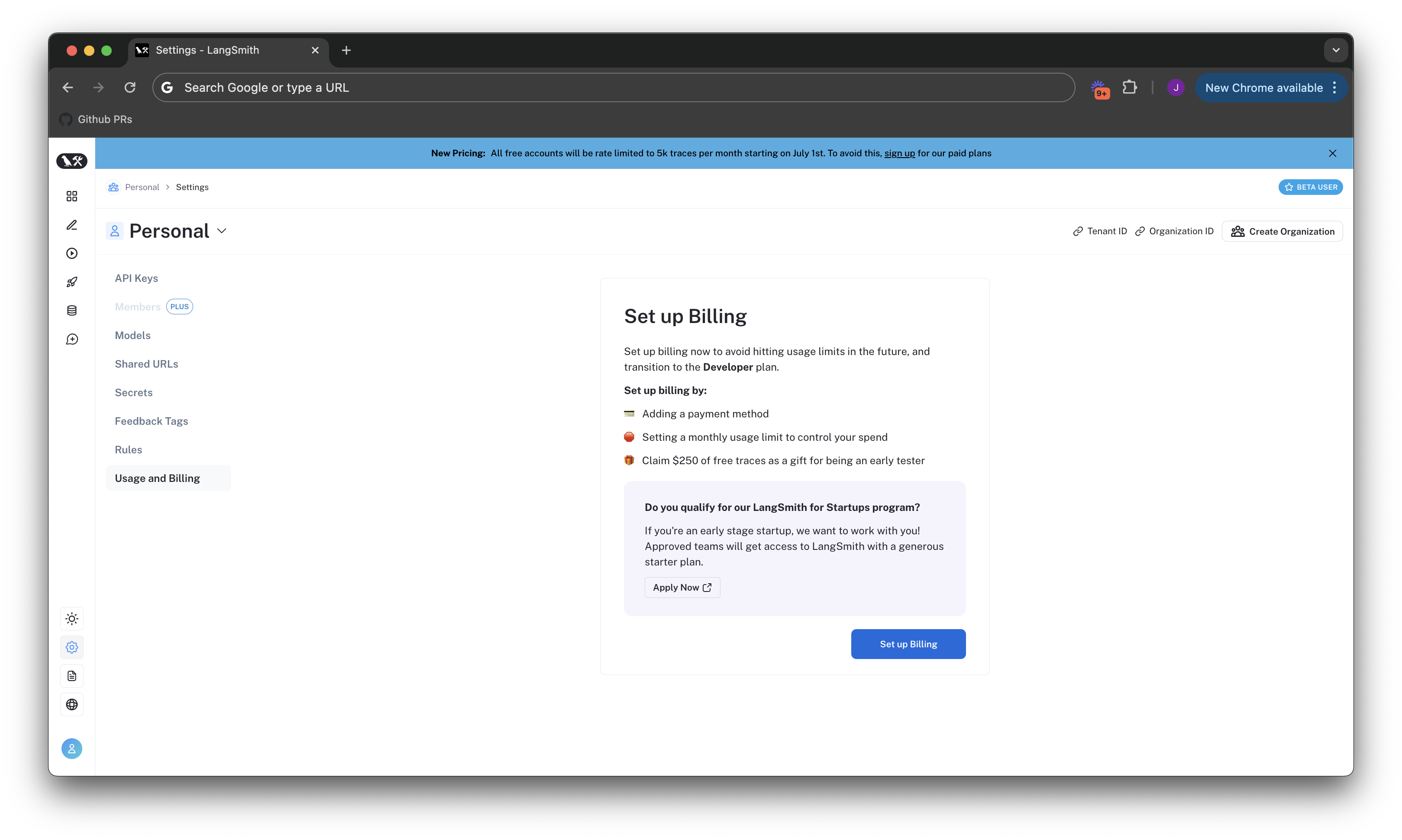 如果您在 2024 年 4 月 2 日引入定价之前加入 LangSmith,您可以选择升级现有账户以设置计费。如果您在 2024 年 7 月 8 日之前未设置计费,则您的账户现在每月限制为最多 5,000 条跟踪。- 导航到设置页面。