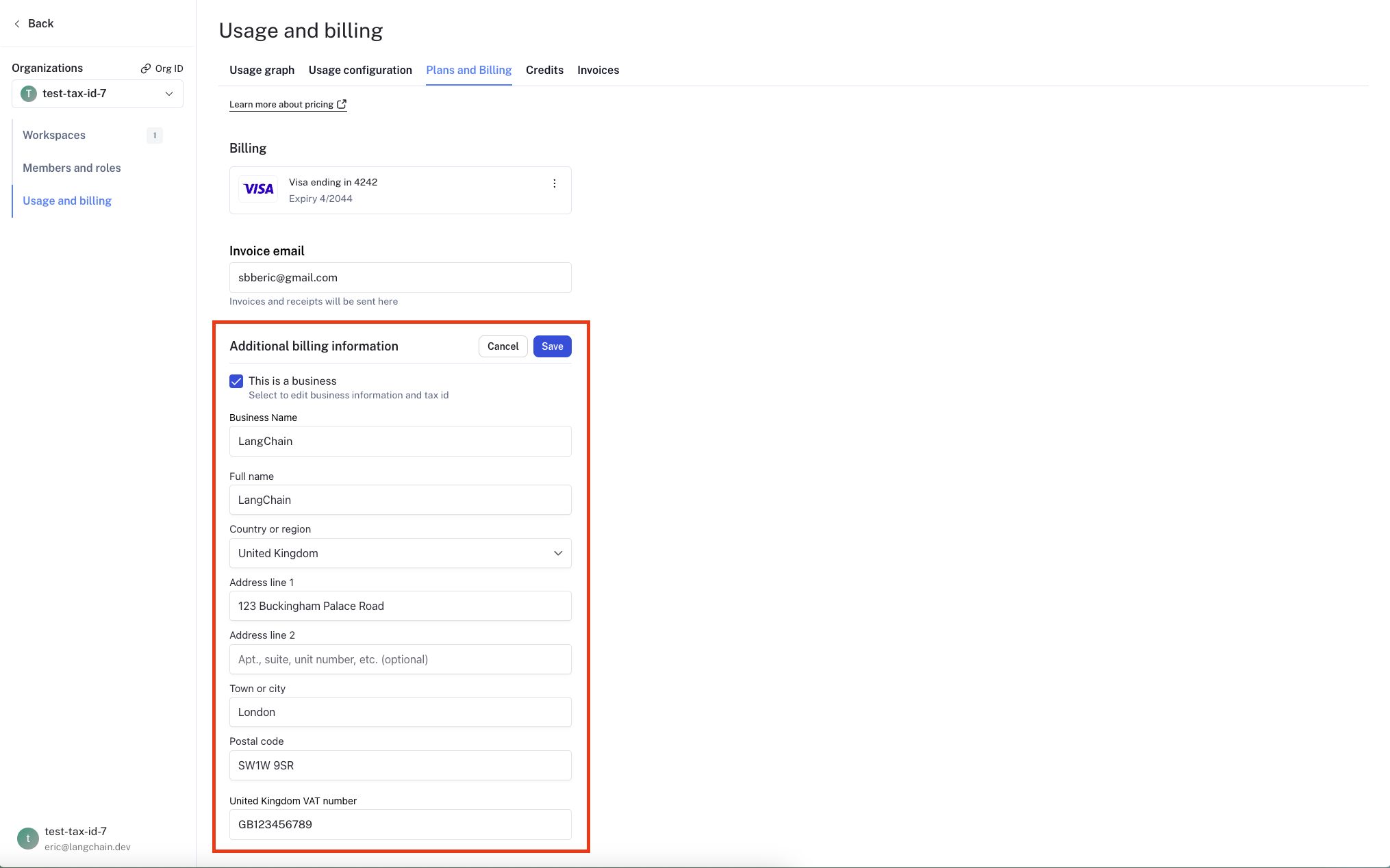 To update business information for your LangSmith organization, head to the Usage and Billing page under Settings and click on the Plans and Billing tab.Business information, tax ID, and invoice email can only be updated for the Plus and Startup plans. Free and Developer plans cannot update this information.