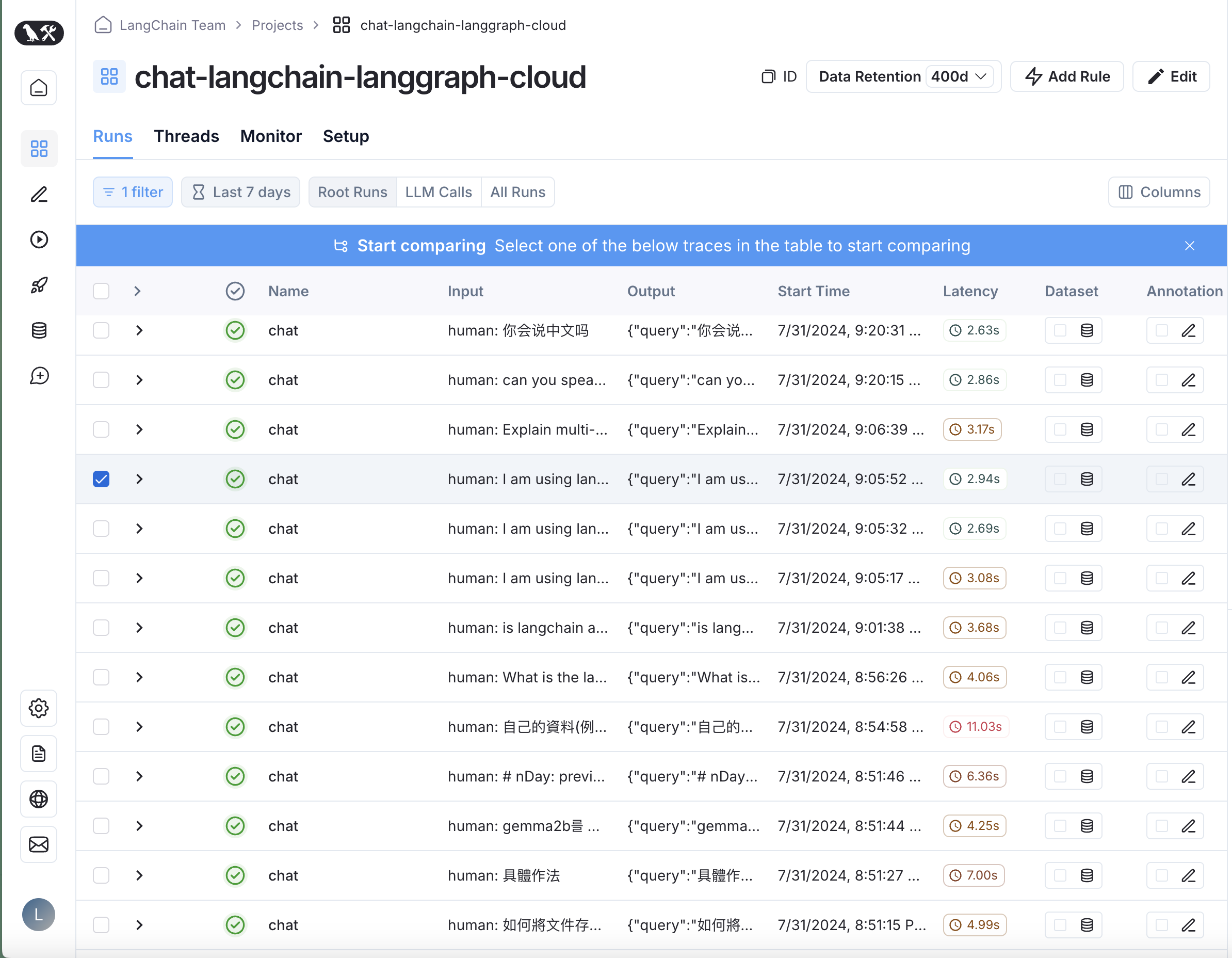 这将显示跟踪运行表。选择您想要与原始跟踪进行比较的跟踪。