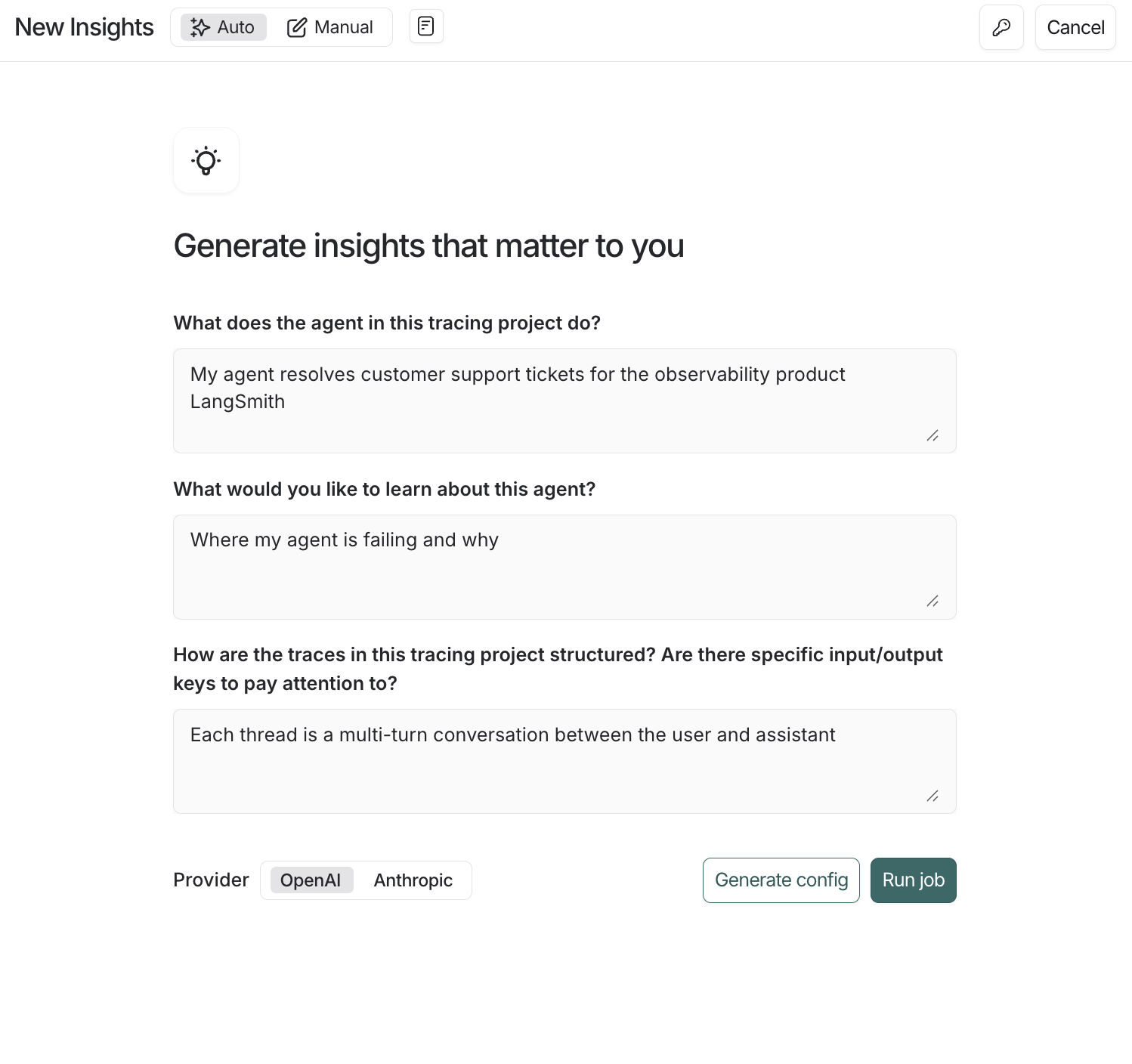 - 回答关于智能体目的、您想了解什么以及跟踪的结构的自然语言问题。Insights 将把您的答案转换为 草稿配置(作业名称、摘要提示、属性和采样默认值)。