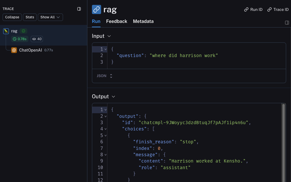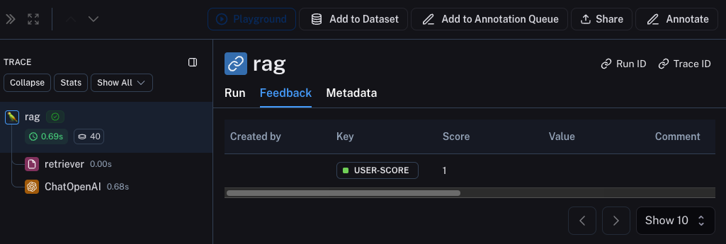 首先,您需要从应用程序记录反馈。一个简单的方法是为每次运行跟踪一个运行 ID,然后使用它来记录反馈。跟踪运行 ID 看起来像这样: