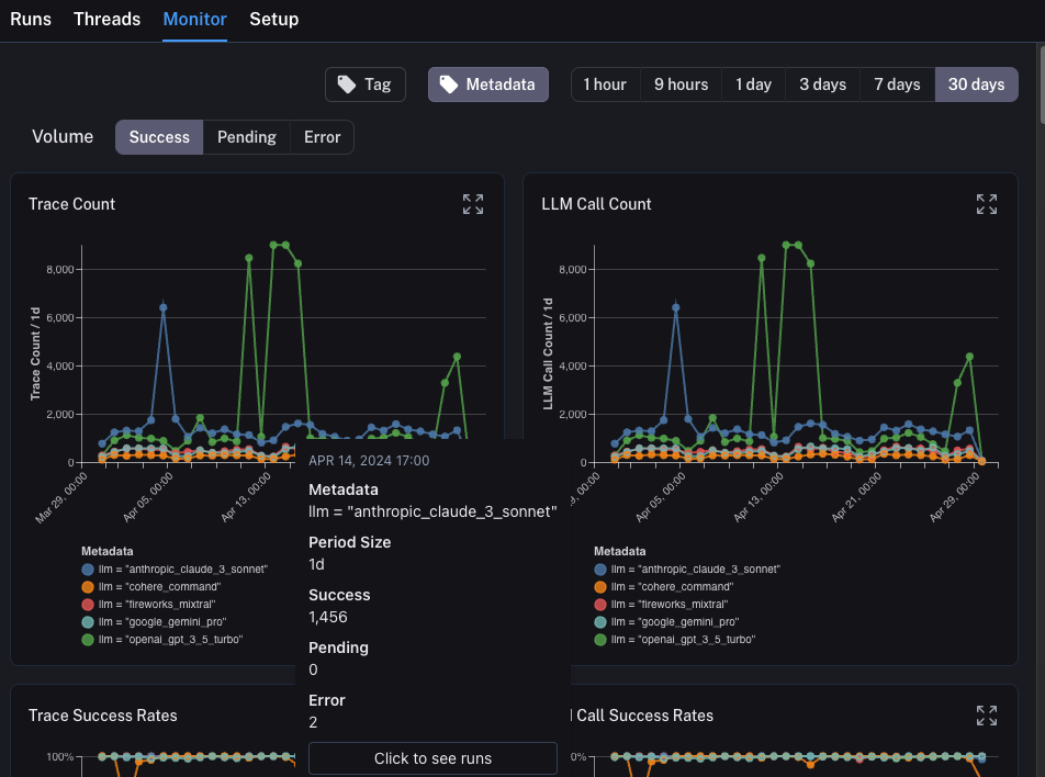 您也可以使用此选项卡执行 A/B 测试版本。在之前的教程中,我们开始跟踪一些不同的元数据属性 - 其中一个是 llm。我们可以按任何元数据属性对监控图表进行分组,并立即获得按时间分组的图表。这允许我们试验不同的 LLM(或提示,或其他)并跟踪它们随时间的性能。