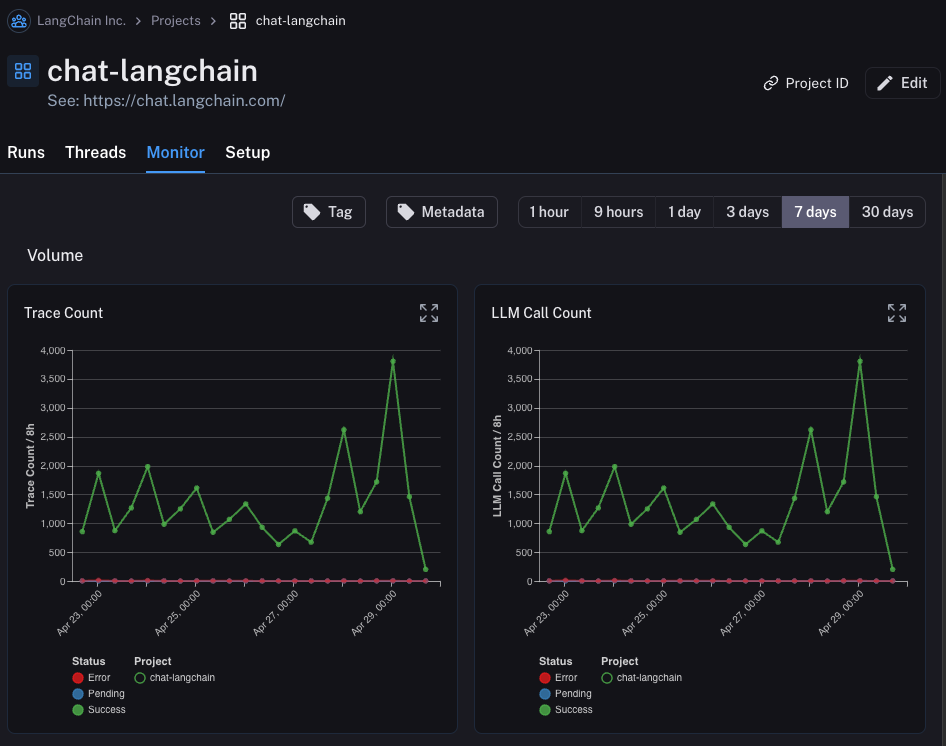 如果您在项目中单击 Monitor 选项卡,您将看到一系列监控图表。在这里,我们跟踪许多 LLM 特定统计信息 - 跟踪数量、反馈、首次令牌时间等。您可以在几个不同的时间范围内查看这些信息。
