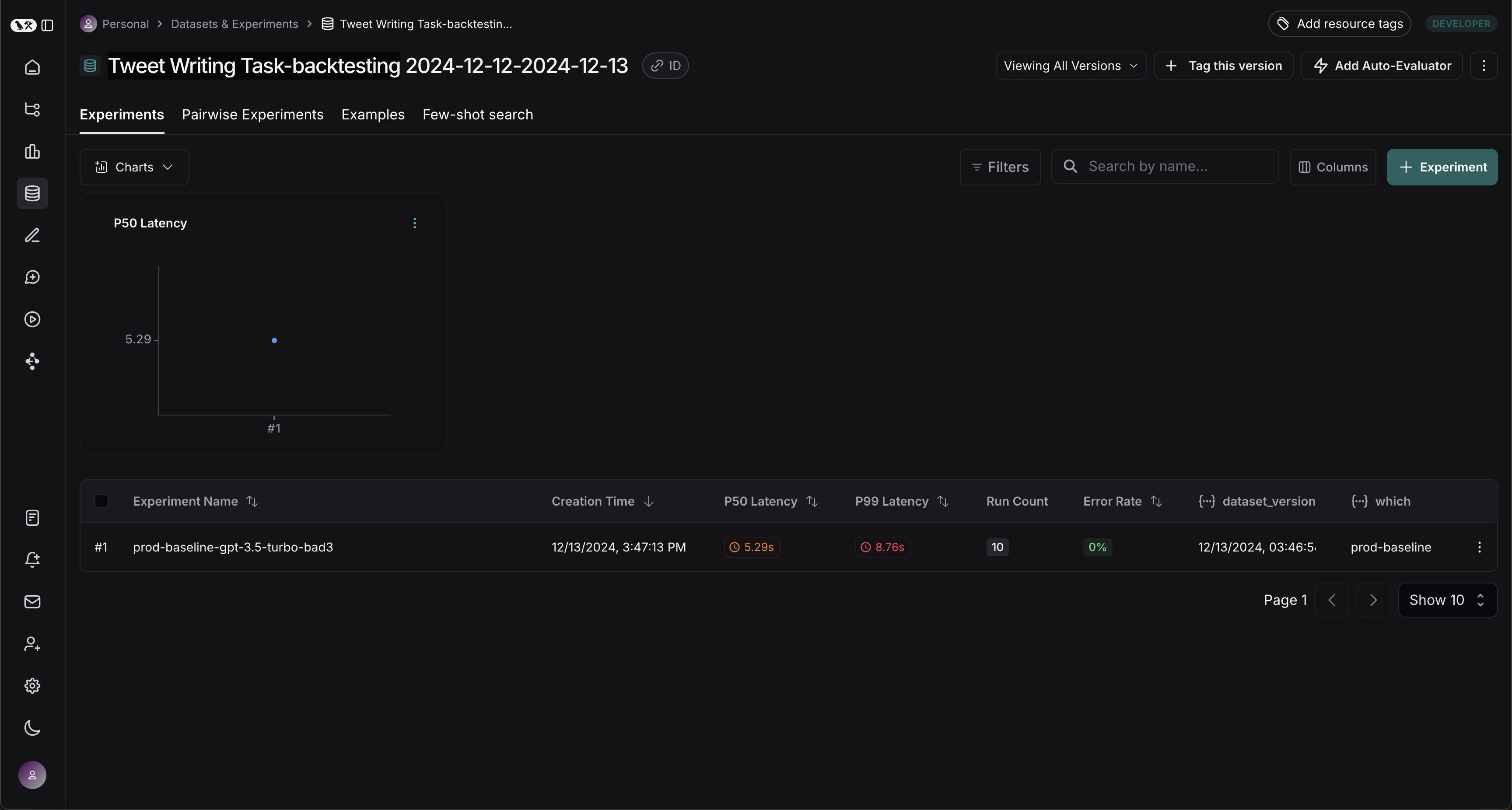 完成上述步骤后,你会在 LangSmith 项目中看到名为 “Tweet Writing Task-backtesting 当日日期” 的新数据集,并附带一个基线实验: