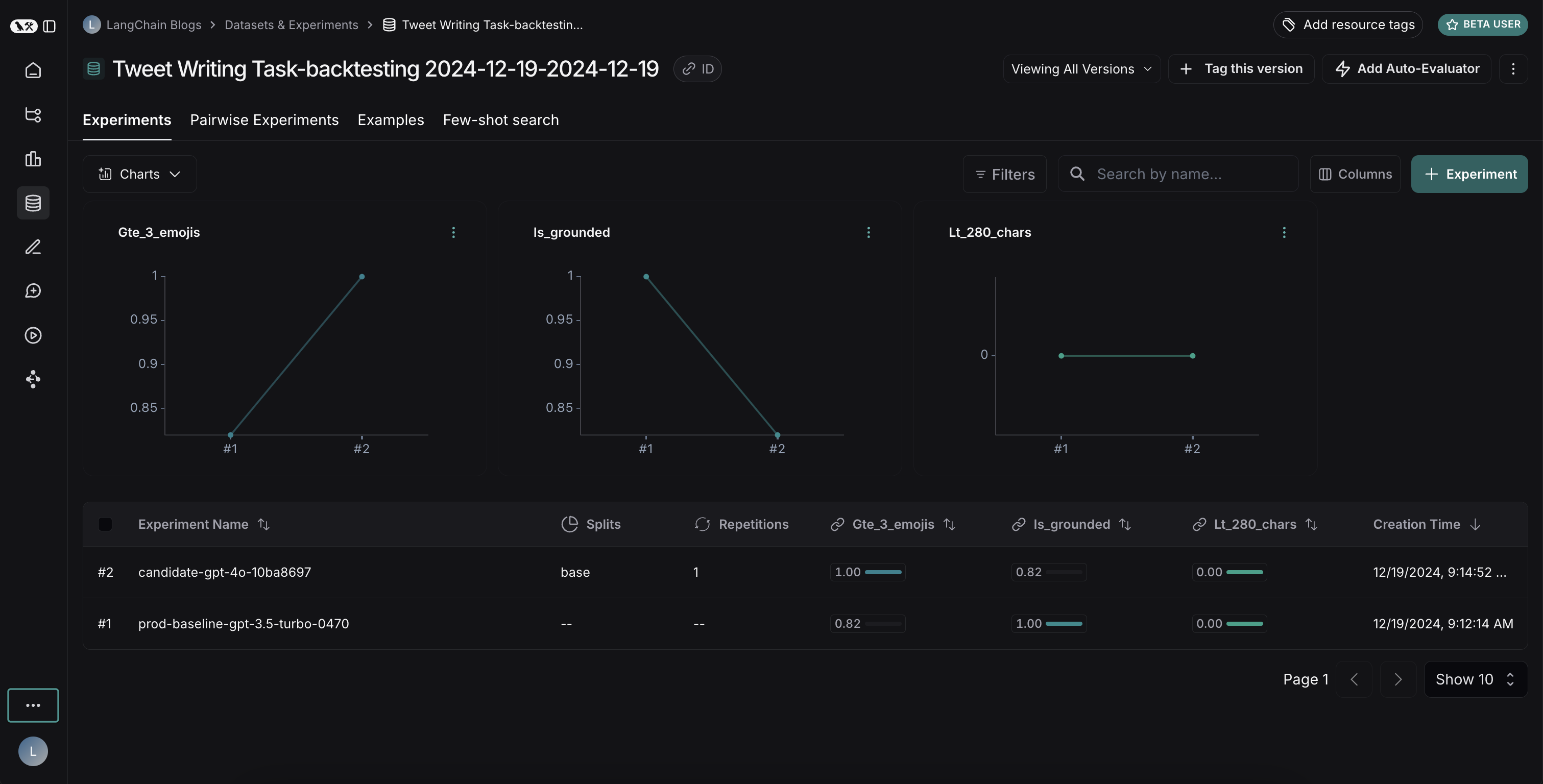 应用部署只是持续改进流程的起点。上线后,你通常需要继续优化提示词、语言模型、工具以及整体架构。回测(Backtesting)指的是利用历史数据评估应用的新版本,并将其输出与原版本对比。相较于仅使用预生产数据集的评估,回测能更直观地反映新版本是否优于当前线上部署。