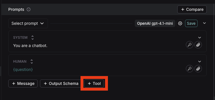 To add a tool to your prompt, click the+ Tool button at the bottom of the prompt editor.