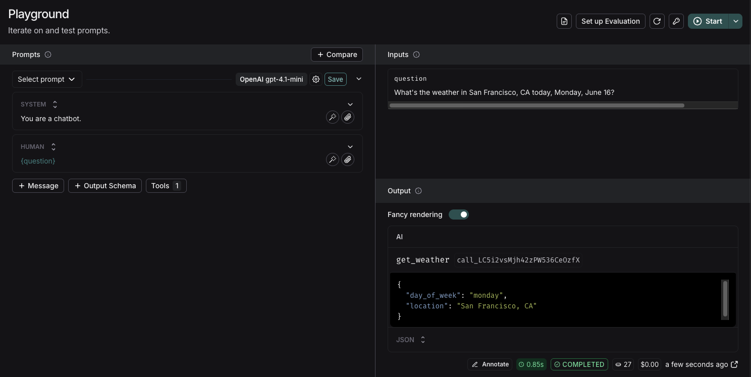 - 自定义工具:您定义用于执行特定任务的函数。当您需要与自己的系统集成或创建专门功能时,这些很有用。当您在 LangSmith Playground 中定义自定义工具时,您可以验证模型是否正确识别并使用正确的参数调用这些工具。我们计划很快支持直接执行这些自定义工具调用。