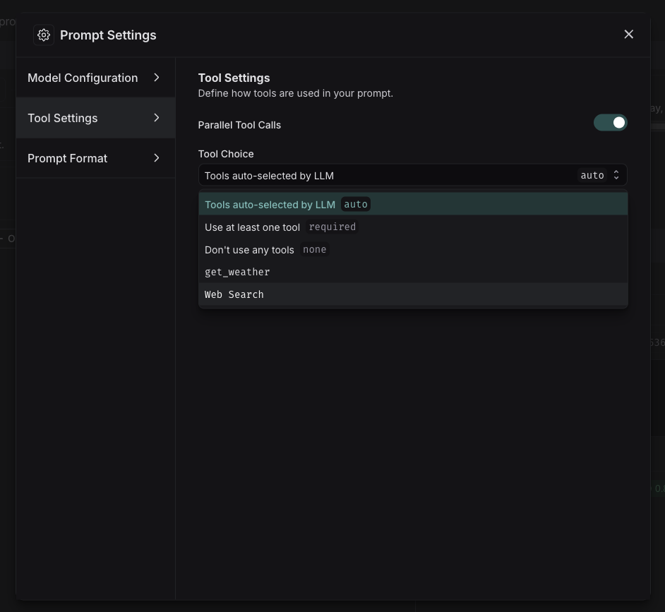 Some models provide control over which tools are called. To configure this:- Go to prompt settings